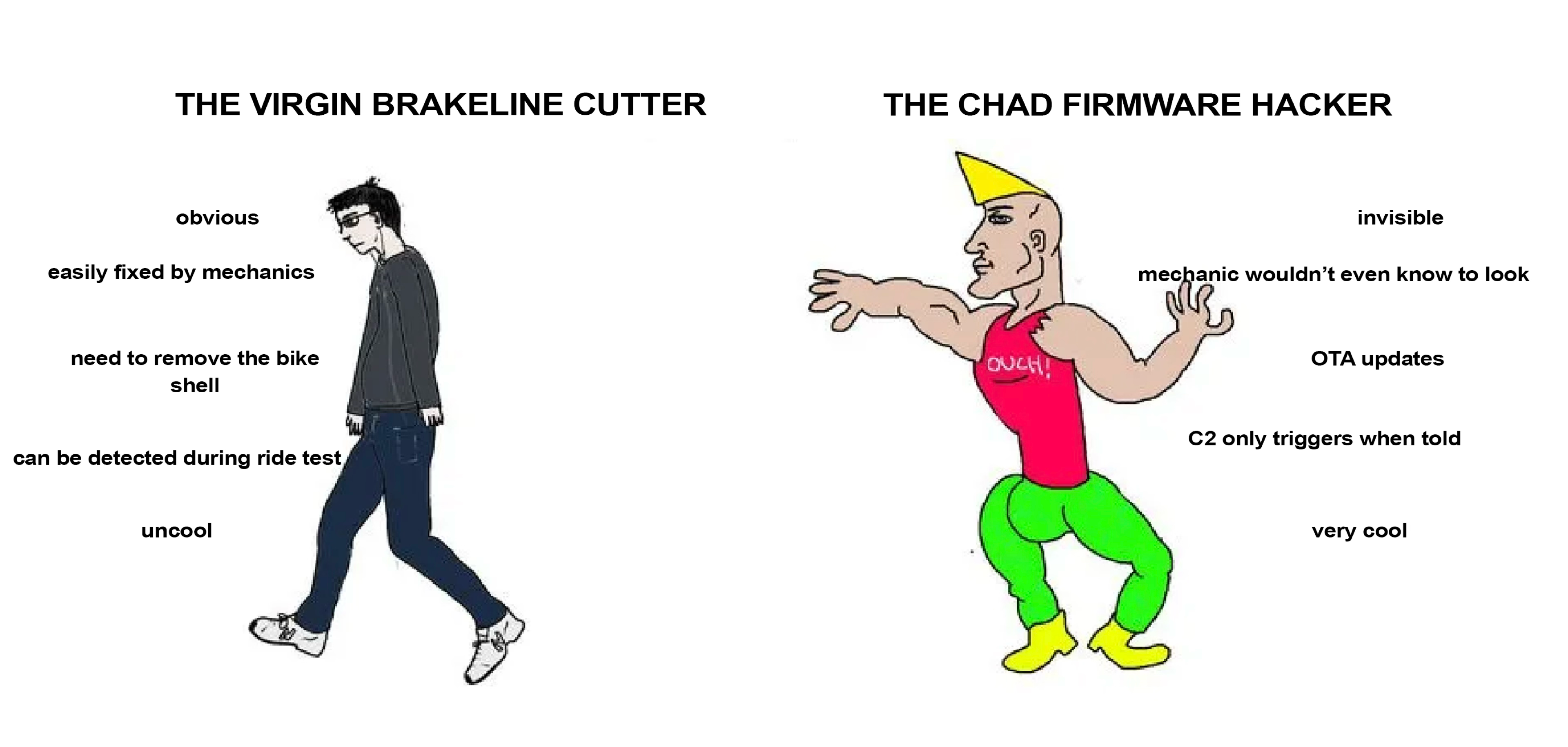Stealth, because unlike cutting the brakelines, it’s not visible to the naked eye, and not necessarily something a mechanic or technician would even think to check. At best, they might recognize it as “something to do with the firmware” and try resetting the bike to factory conditions or re-installing updated firmware. But remember, we own the bike’s entire operating system at this point. This is advantage 2: Resilliance to repair. In another security blunder, the “restore to factory defaults” logic is entirely firmware-controlled. A sufficiently-sophisticated malware would prevent its own removal by hooking the functions in charge of the reset, preventing EEPROM writes while displaying the expected "System settings have been restored to defaults\n" message to the user. Because the (OTA-distributed) firmware controls its own updates, it could institute logic to intercept attempted firmware updates and reinfect them. The only mediation (besides implementing secure boot at a hardware level) would be to physically replace the ECU, or access the ECU’s direct hardware debug interface over JTAG/SWD and reflash from there.